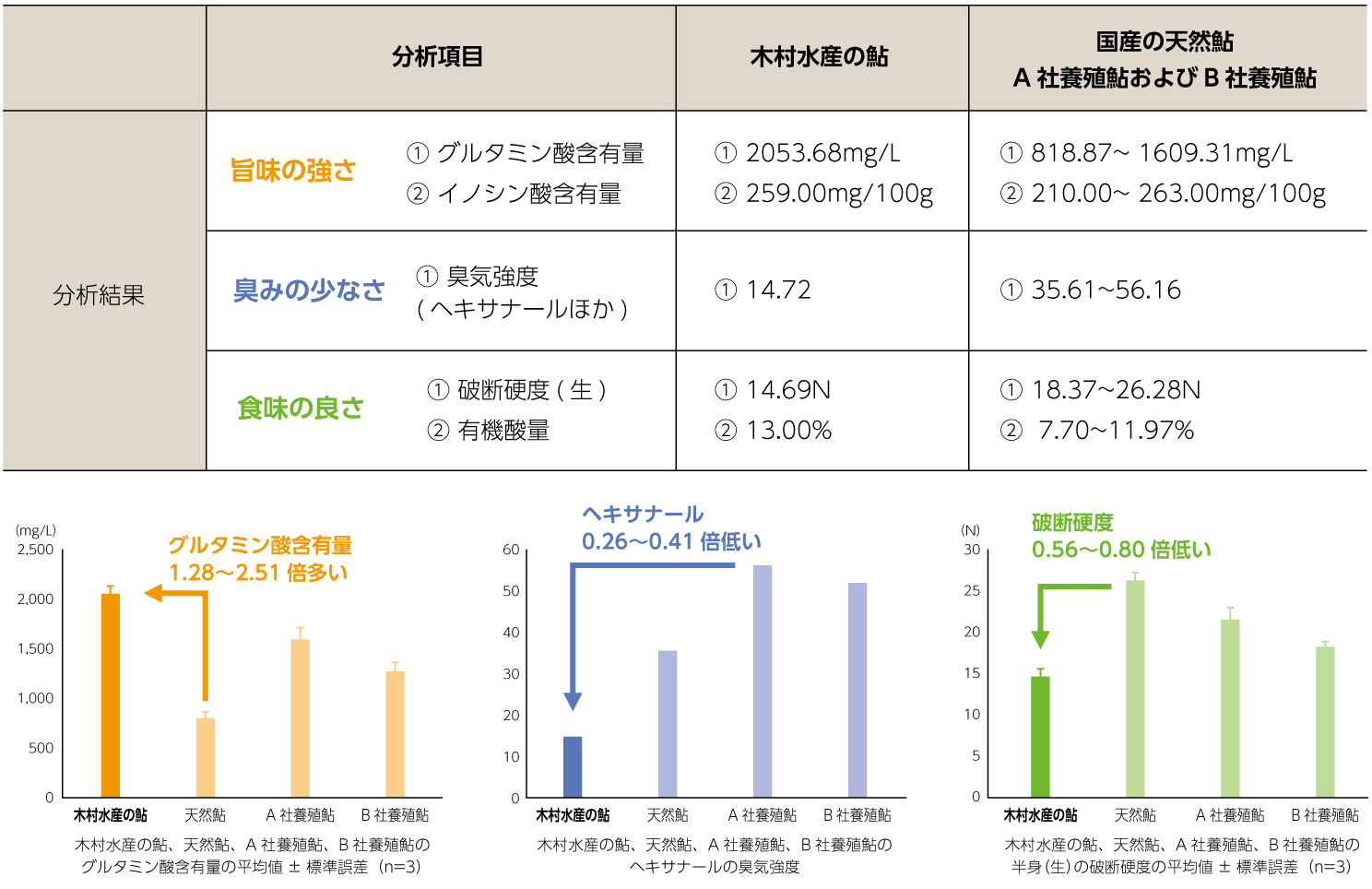 木村水産の鮎は、国産の天然鮎、他社養殖の鮎と比較して、グルタミン酸含有量が1.28~2.51倍、イノシン酸含有量が0.98~1.23倍、臭気成分が0.23~0.55倍、破断硬度が0.56~0.80倍、有機酸量が1.09~1.69倍であり、旨味が強く、臭みが少なく、やわらかい肉質とコクが味わえる鮎であることが明らかとなった。